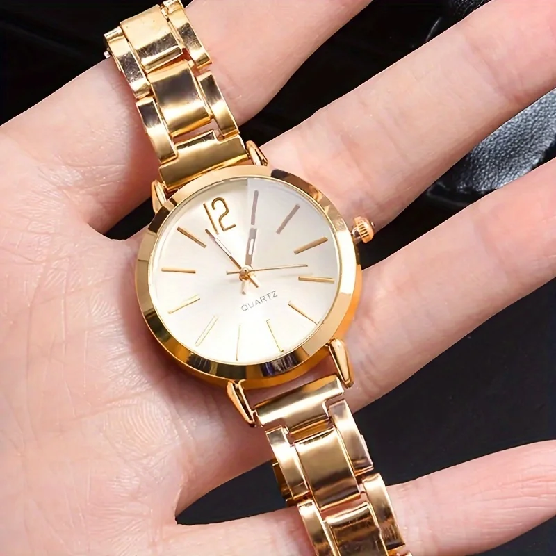 Este conjunto de relógio apresenta um design de mostrador simples com uma pulseira oca, oferecendo um visual estiloso e elegante para qualquer ocasião.
